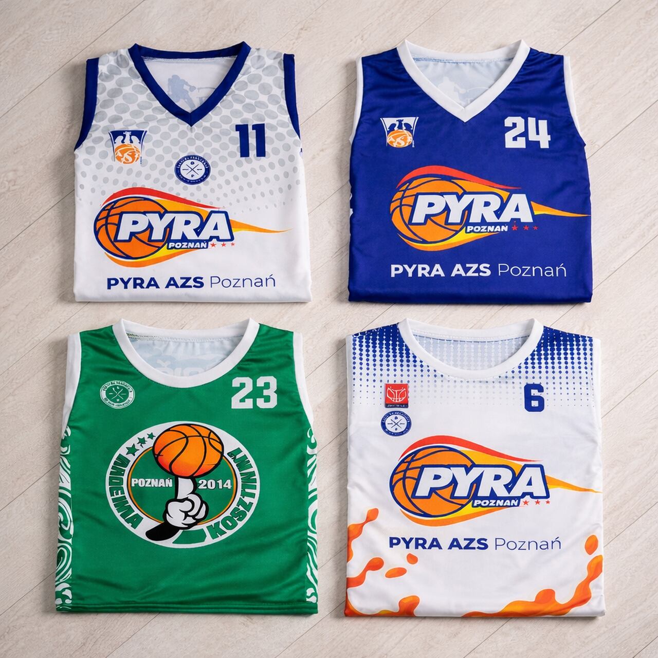 Jesteśmy elastyczni – nie ograniczamy ilości nadruków. Dowolna ilość grafik, tekstów czy logo, wszystko w jednej cenie stroju. Tworzymy dla Ciebie nie tylko odzież sportową, ale także unikalne stroje sportowe na parkiety koszykarskie.